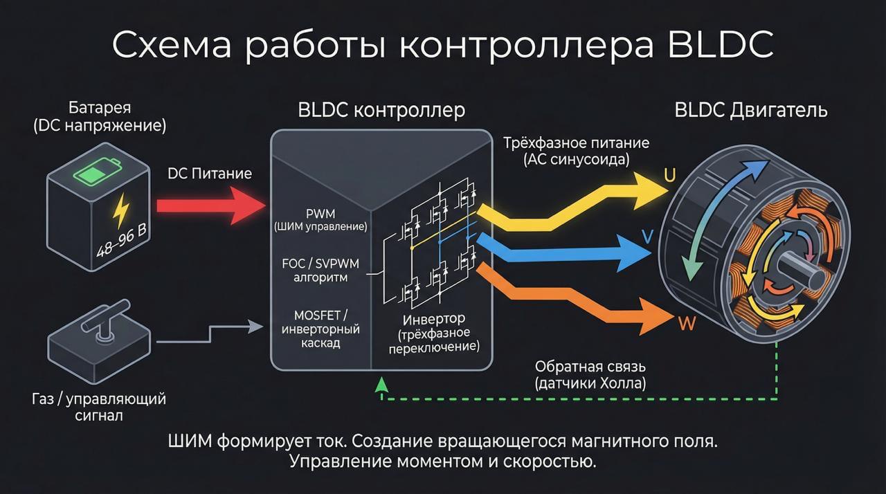 В электротранспорте контроллер работает не в «идеальных условиях», а под постоянной нагрузкой: резкие разгоны подъёмы перегрузки просадки напряжения Если он подобран неправильно, система либо не раскрывает мощность, либо начинает перегреваться и терять стабильность. Как работает контроллер BLDC Контроллер управляет подачей тока на фазы двигателя через ШИМ (PWM), формируя вращающееся магнитное поле. Современные алгоритмы управления — FOC и SVPWM — позволяют: добиться плавного разгона снизить нагрев повысить КПД стабилизировать работу под переменной нагрузкой Это особенно важно для транспорта, где режим работы постоянно меняется.