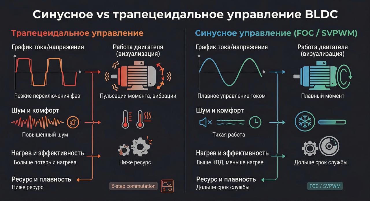 Первый — тип управления. Трапецеидальные контроллеры проще, но дают пульсации момента и шум. Синусные (FOC / SVPWM) обеспечивают плавность, меньший нагрев и более высокий ресурс.